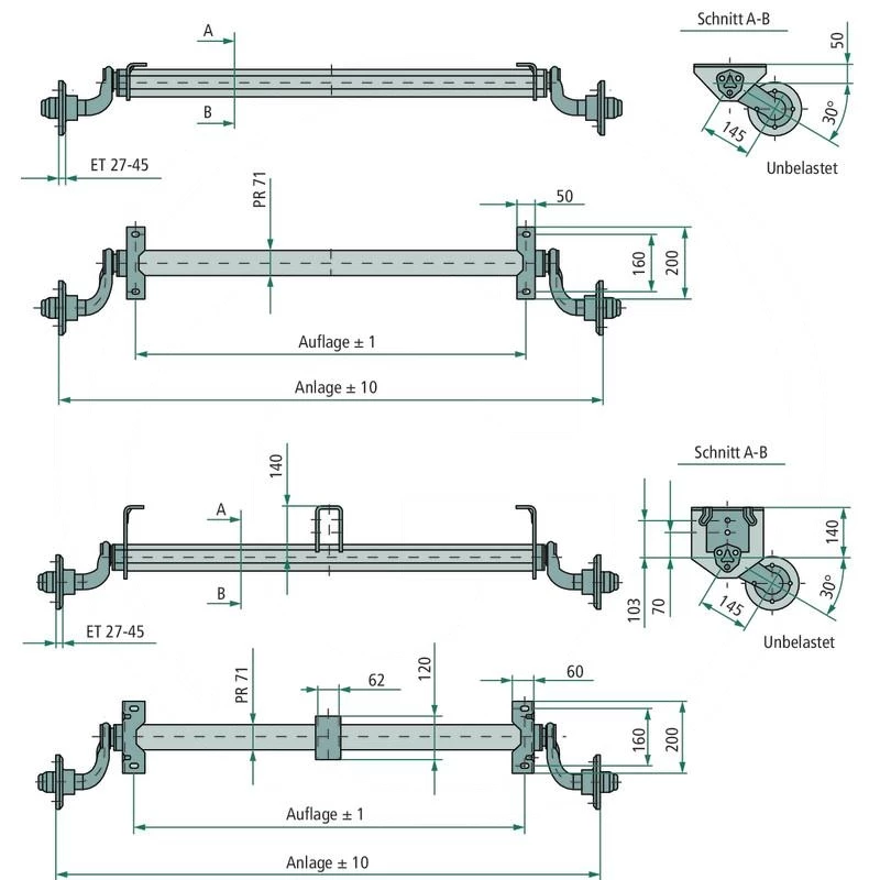 Akseli jarruton 750kg B1200 C1630mm AL-KO akseli optima 5X112
