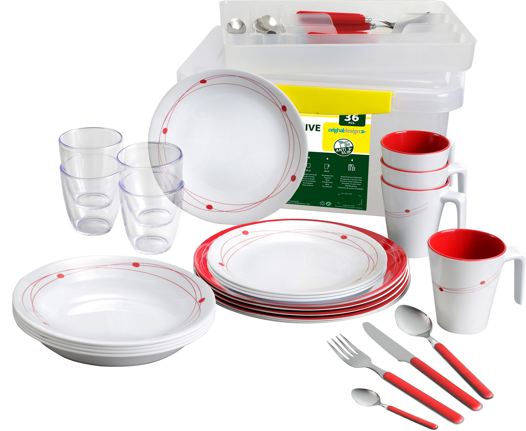 Rohkea katseenvangitsija ruokailuun. All inclusive -astiastossa on kaikki, mitä voi tarvita näyttävän kattauksen rakentamiseen. Mukana kätevä säilytyslaatikko.