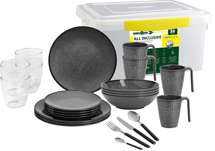 All inclusive melamiiniastiasto. Kahvimukit ovat pinottavaa mallia, jonka ansiosta arvokasta tilaa säästyy keittiössä. Mukana kätevä ja kestävä säilytyslaatikko.