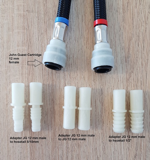 Sovitesarja John Guest 12 mm liittimeen. 2 x 8 / 10 mm letkuliitos 2 x 1/2" letkuliitos 2 x JG 12 mm uros