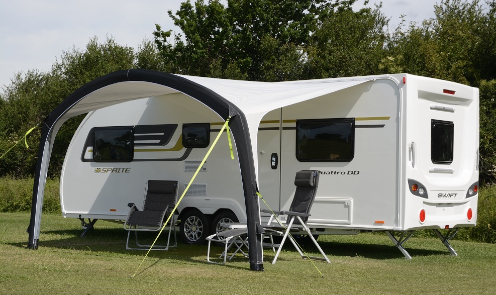 Ilmatäytteinen matkailuvaunun katos, leveys 4 m. Innovatiivinen Sunshine AIR korvaa metallitangot tukevalla AIR Frame -rungolla. Rentoudu mukavasti varjossa kesäauringosta tai nauti yksityisyydestä... Lue lisää