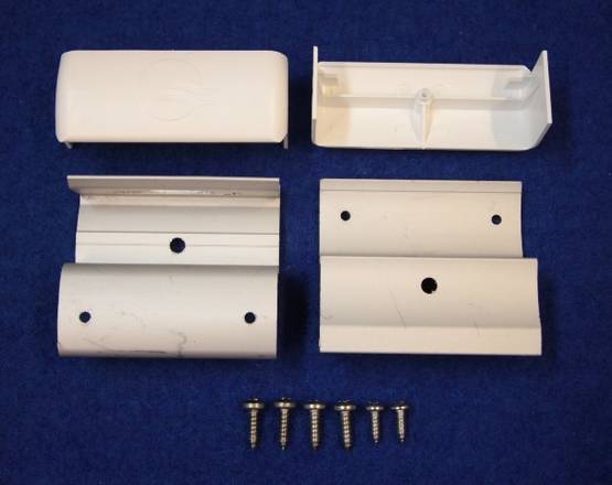 2 kiinnikettä, 2 valkoista koteloa.