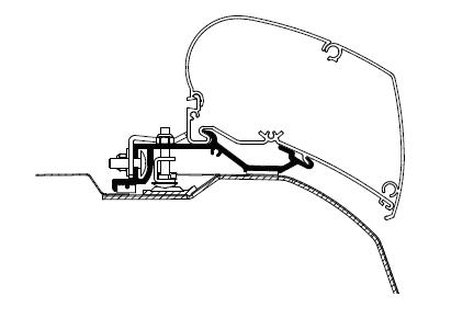 Adapteri + EPDM tiivisteprofiili. Kiinnikkeet: 2 x 27 cm + 1 x 10 cm (L2H2 3.25 m), kattomarkiisiin. Ducato | Jumper | Boxer Adapter Serie 6 >2007 L2H2 3.25m