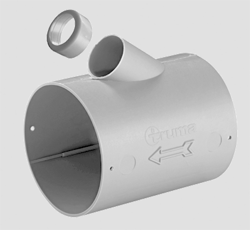 Haaroituskappale Ø 65 mm tai Ø 72 mm putkelle, haara Ø 22 mm putkelle päätyläpiviennillä, esim. jääkaapin tuuletukseen kesällä.